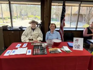 SAR Desoto Trace Chapter President Rodney Young and DAR Akansa Chapter Regent Becky Brewton shared a table at the Coronado Center during the Hot Springs Village, AR Meet and Greet…