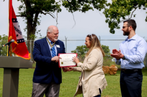 North Little Rock, AR – April 8, 2026 – ARSSAR President Dr. Darrell Over (left) and Compatriot Jeffrey Alexander, Bayou Bartholomew Chapter, (right) present a Certificate of Appreciation to Ms.…